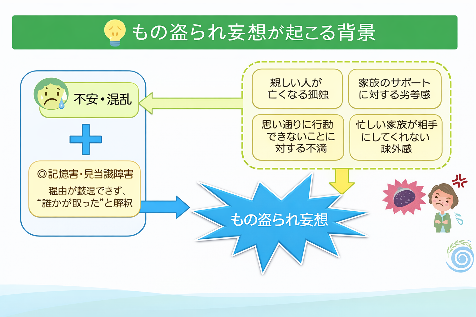 もの盗られ妄想は、不安や混乱、環境の変化などが重なって強く出ることがあります。