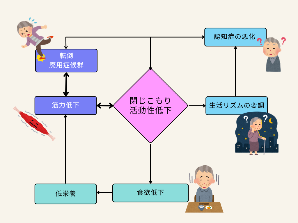 「閉じこもり→筋力低下・低栄養・生活リズムの乱れ→認知症悪化」という連鎖が起きやすくなります。