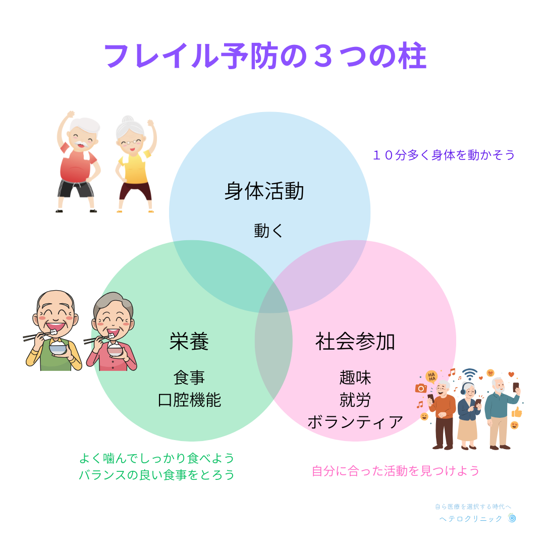 「フレイル予防の3つの柱」――身体活動・栄養・社会参加のバランスを整える方法を、図を用いて解説します。
