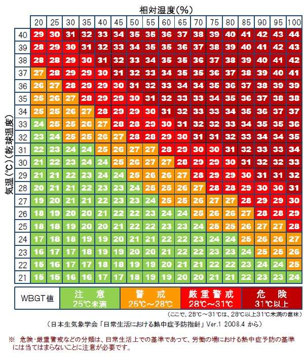 WBGT値と気温、相対湿度との関係の表を載せています。