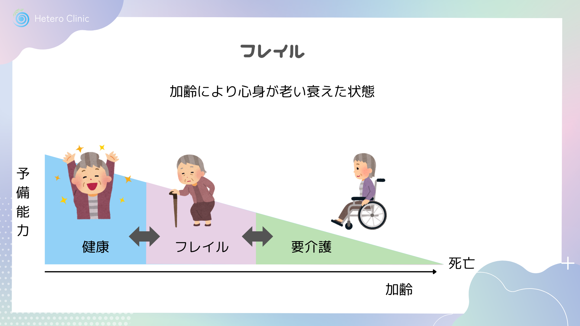 フレイルとは、病気ではないけれど、年齢とともに、筋力や心身の活力が低下し、