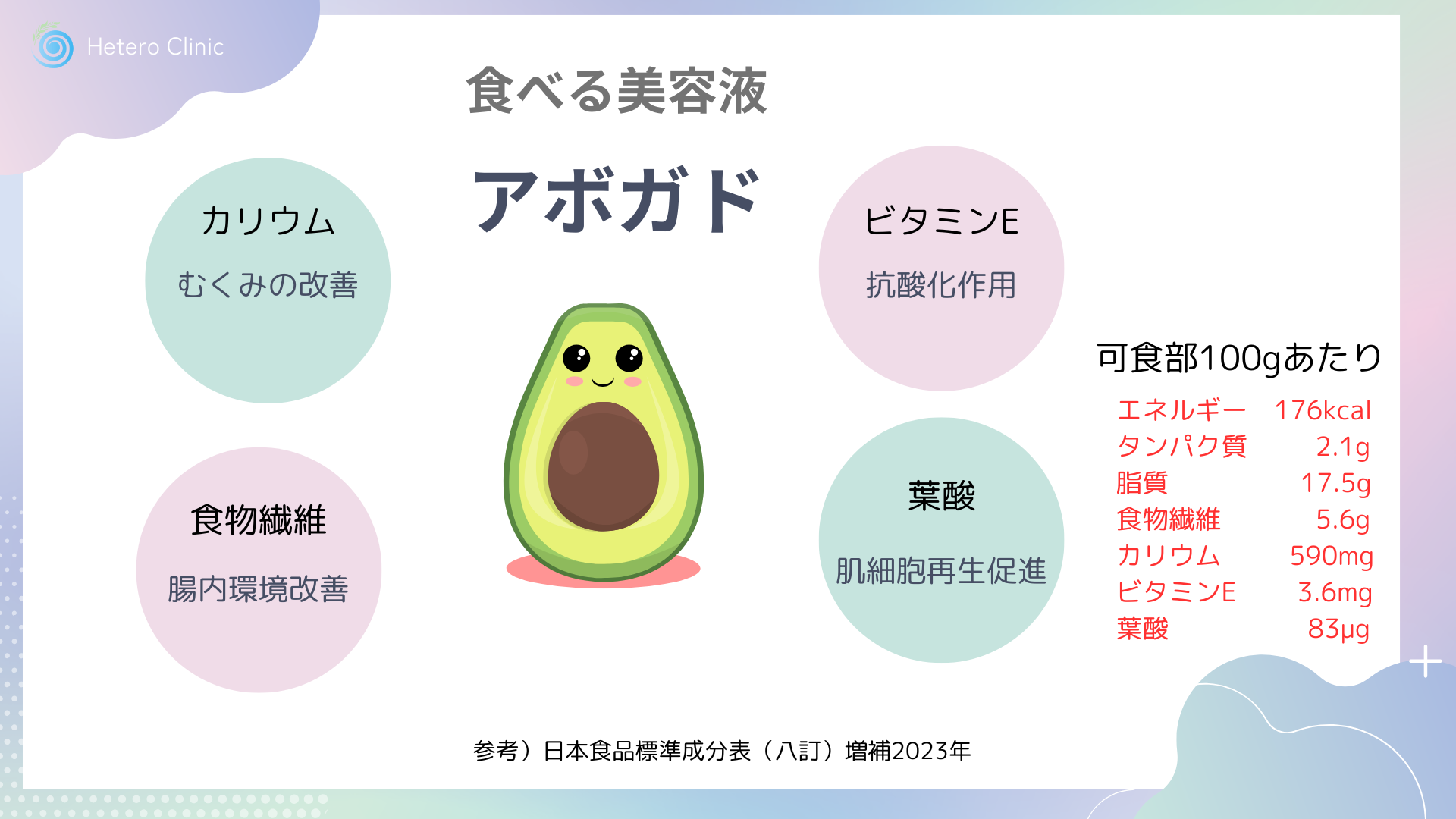 さらにアボカドに少量含まれているビタミンCが、肌のコラーゲン生成をサポートします。